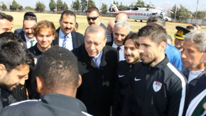 Karşılama töreninde Başkan Abdullah Mergen, Teknik Direktör Sait Karafırtınalar, teknik heyet, Genel Müdür Nuri Dolgun ve futbolcular ile bir araya gelen Cumhurbaşkanı Erdoğan, tek tek tokalaştı.