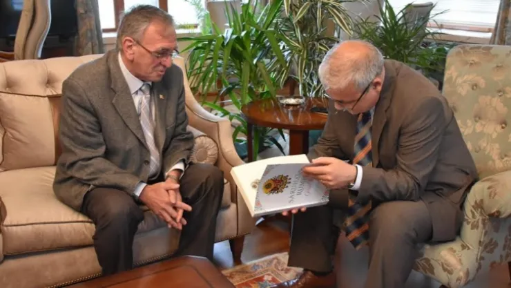 Manisalı araştırmacı yazar İlber Şiyak Manisa Valisi Mustafa Hakan Güvençer'i ziyaret ederek 5. Kitabı 'Saruhan'dan Rumeli'ye Gönül Köprüleri' isimli kitabını hediye etti.