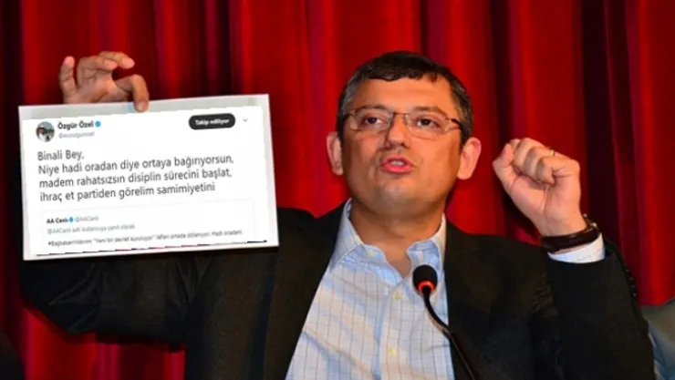 Özgür Özel, sosyal medya hesabından “Binali Bey, Niye hadi oradan diye ortaya bağırıyorsun, madem rahatsızsın disiplin sürecini başlat, ihraç et partiden görelim samimiyetini” dedi.