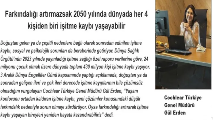 - Cochlear Türkiye Genel Müdürü Gül Erden,işitme kaybının küresel maliyet yükünün bir trilyon dolara yaklaştığına dikkat çekti