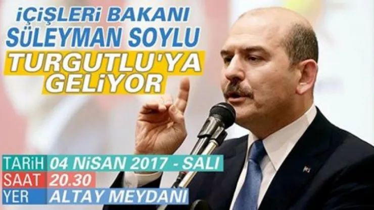 AK Parti Turgutlu İlçe Başkanı Mürşit Gedizli, İçişleri Bakanı Süleyman Soylu'nun 4 Nisan Salı günü Turgutlu ya geleceğini belirtti.