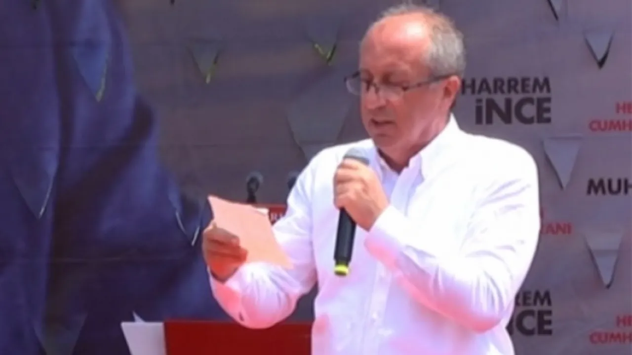 İnce, "Bana diyor ki ’hayrola seçim yaklaştı camilerde görünüyorsun’ diyor. Ben 5 vakit namaz kılan bir adam değilim ama 15 yaşımdan beri cuma namazlarına giden birisiyim. Seçim için gitmiyorum ki her cuma yaptığım bir iş. 15 yaşımdan beri 40 senedir yaptığım bir iş. Neredeyse diyecek ki gelme bizim camiye diyecek. Böyle bir şey olur mu? diye devam etti. Erdoğan’a çağrıdan bulunan İnce, "Ona Çorlu’dan bir kez daha sesleniyorum. Erdoğan, kimyanın bozulduğunu biliyorum, moralinin bozuk olduğunu biliyorum. Anketleri gördüğünde canının sıkıldığını biliyorum. Bak kaldı şurada 2-3 gün madem sen ustasın. Usta adam çıraktan korkar mı? Erdoğan gel 81 milyon bizi izlesin. İstediğin kanalda istediğin saatte istediğin gazetecilerle gel benimle ekonomi tartış gel. Erdoğan sana sesleniyorum sana yüreğin varsa bilgin varsa cesaretin varsa karşıma çık" ifadelerini kaydetti.