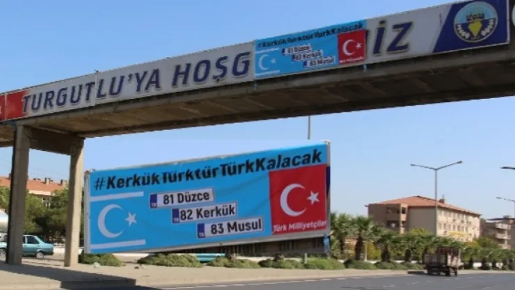 Kerkük Türk’tür, Türk Kalacak hashtag’i ile asılan pankartta, “81 Düzce, 82 Kerkük, 83 Musul. Türk Milliyetçileri” ifadeleri yer aldı.
