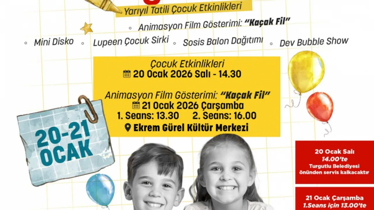 Turgutlu Belediyesi ve Manisa Büyükşehir Belediyesi tarafından yarıyıl tatiline giren çocuklar için dopdolu bir etkinlik programı hazırlandı. İki gün boyunca sürecek ‘Yarıyıl Tatili Çocuk Etkinlikleri’ ile minikler eğlence dolu anlar yaşayacak. Etkinlikler kapsamında 20 Ocak Salı günü mini disko, Lupeen Çocuk Sirki, sosis balon dağıtımı ve dev bubble show yapılacak. Ardından 21 Ocak Çarşamba günü ise ‘Kaçak Fil’ Animasyon Film Gösterimi gerçekleşecek.